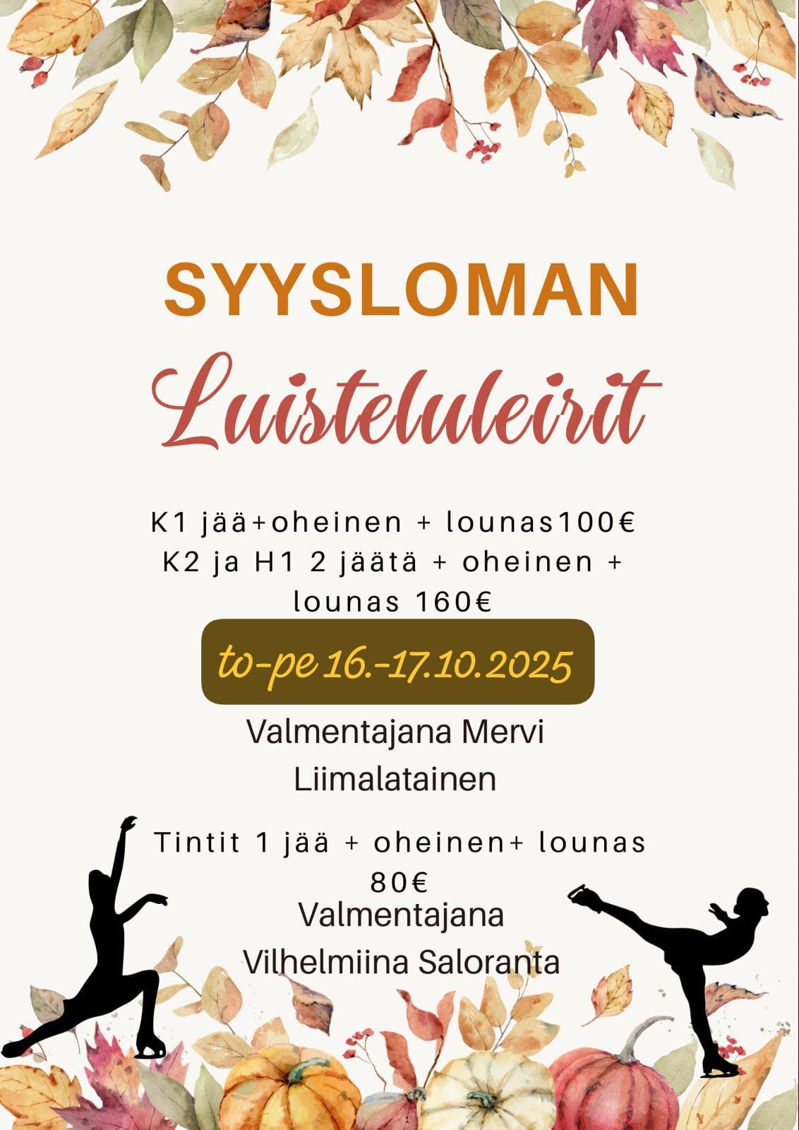 Syysloman leiripäivät ovat vihdoin selvillä. Ne ovat to-pe 16.-17.10. Tarjolla on: - Tinteille jää, oheinen ja lounas /pvä hintaan 80€ - K2 ja H1 -ryhmille 2 jäätä, oheinen ja lounas /pvä hintaan 160€…