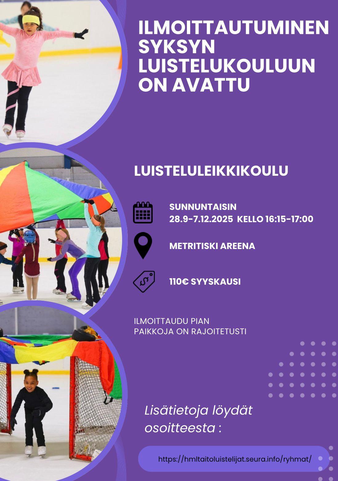 Haluatko oppia luistelemaan? Meillä se onnistuu positiivisessa ja kannustavassa ympäristössä koulutettujen ohjaajien johdolla. Taaperoryhmässä kaikkein pienimmät tutustuvat luisteluun yhdessä oman turvallisen aikuisen kanssa ja luisteluleikkikoulussa 3-6-vuotiaat lapset ottavat ensiaskeleitaan jäällä leikin varjolla ohjaajien avustamina. Kouluikäisten taitoluistelukoulut tarjoavat kouluikäisille mahdollisuuden oppia luistelun saloja ja kokea onnistumisen elämyksiä. Lue lisää ryhmistämme ja tule mukaan...